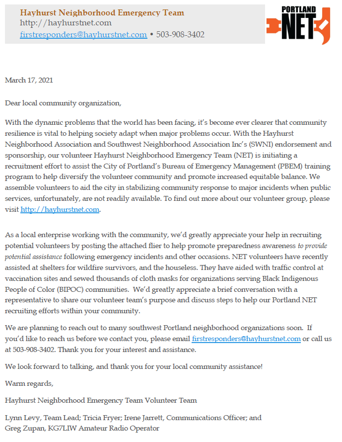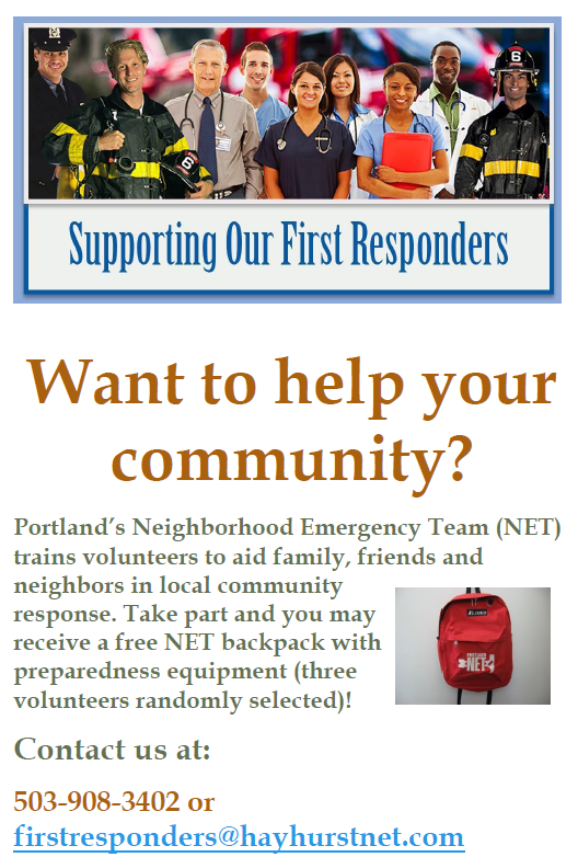 - Please contact firstresponders@hayhurstnet.com to begin taking active part in meetings with your local NET volunteer group. Please contact the Hayhurst NET volunteers Assistant Team Lead Greg Zupan at 503-908-3402 for any questions.